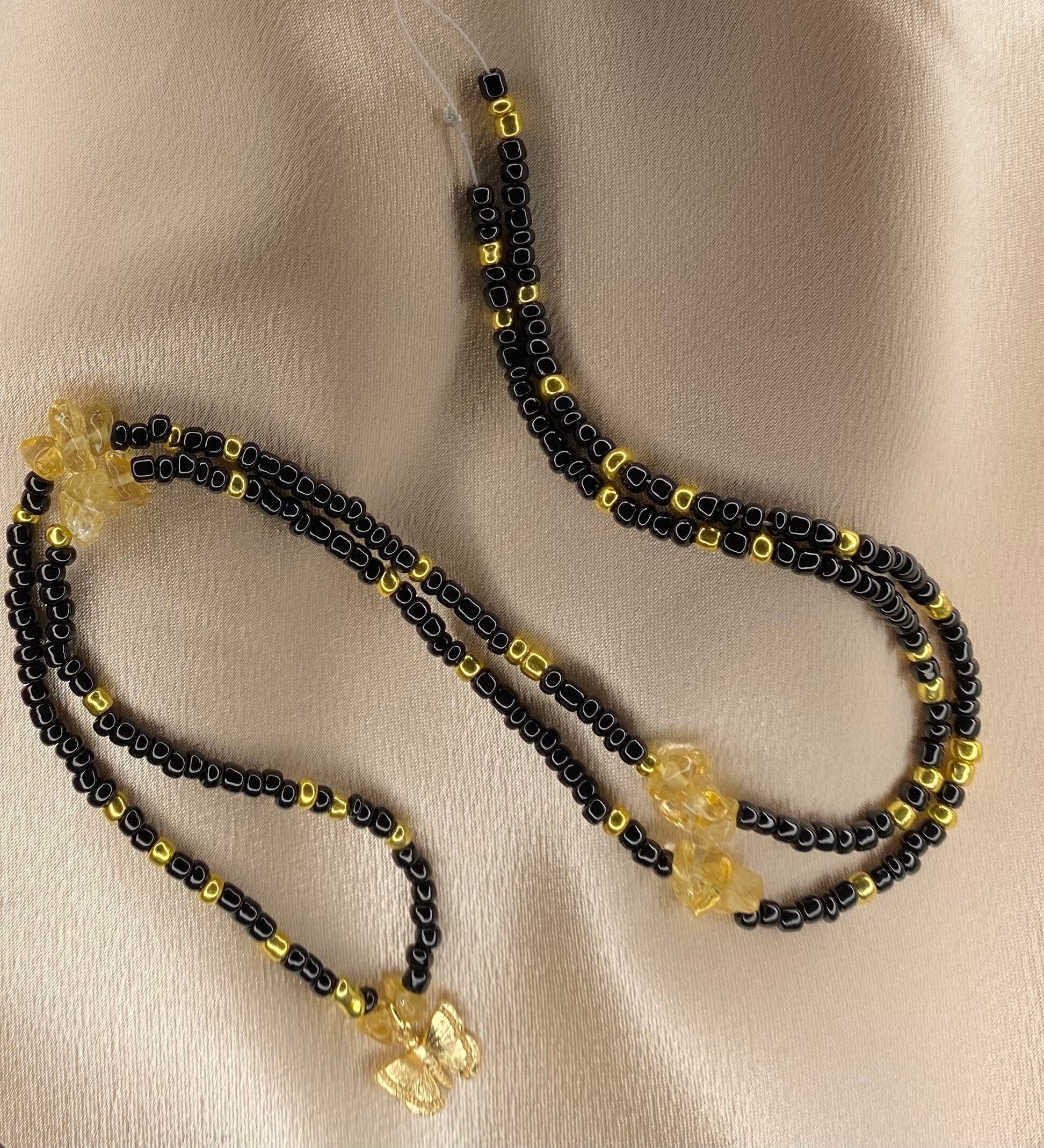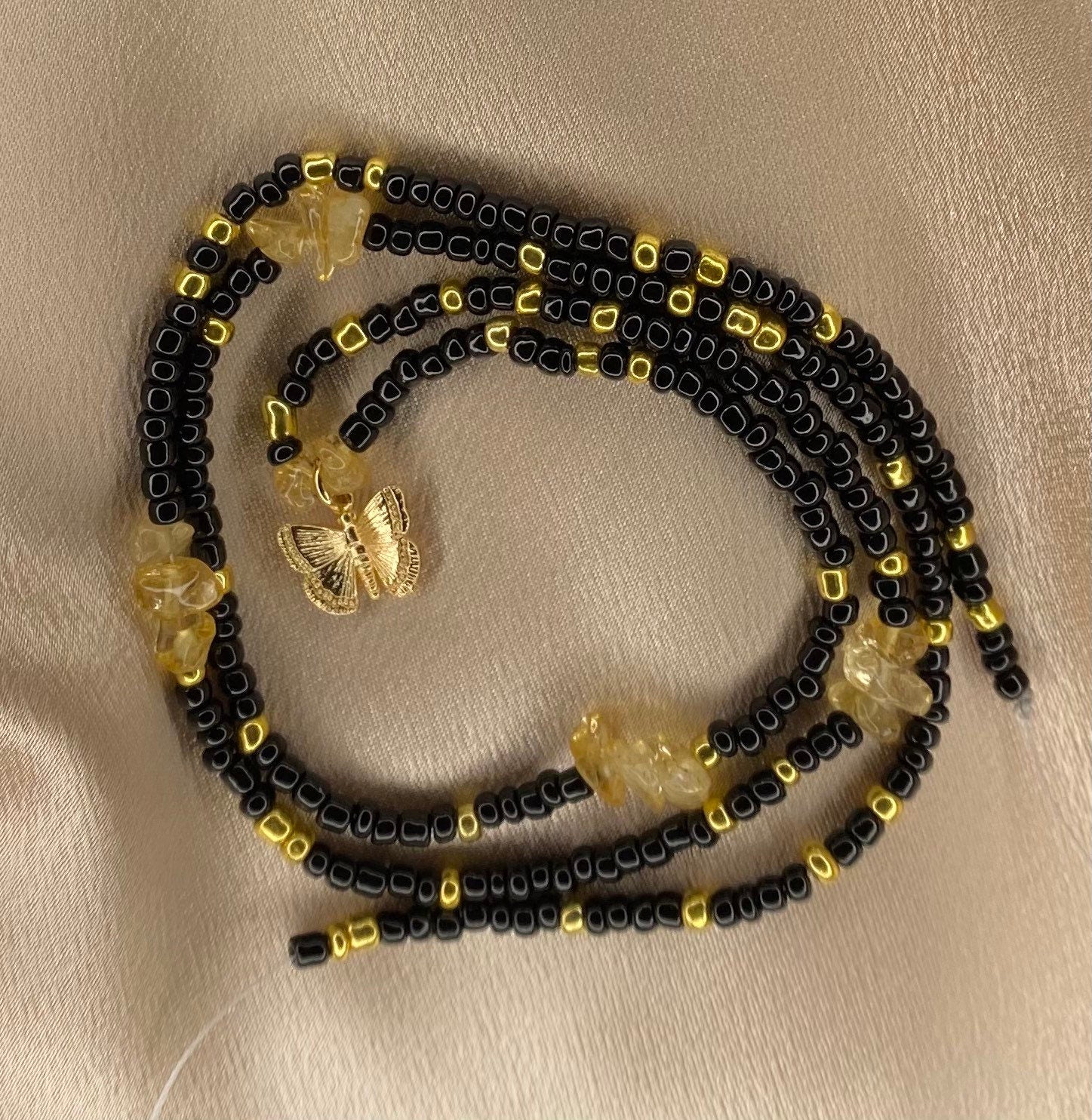 Made to order waistbeads with black & gold glass beads, citrine crystals, and a 14k gold filled butterfly charm.