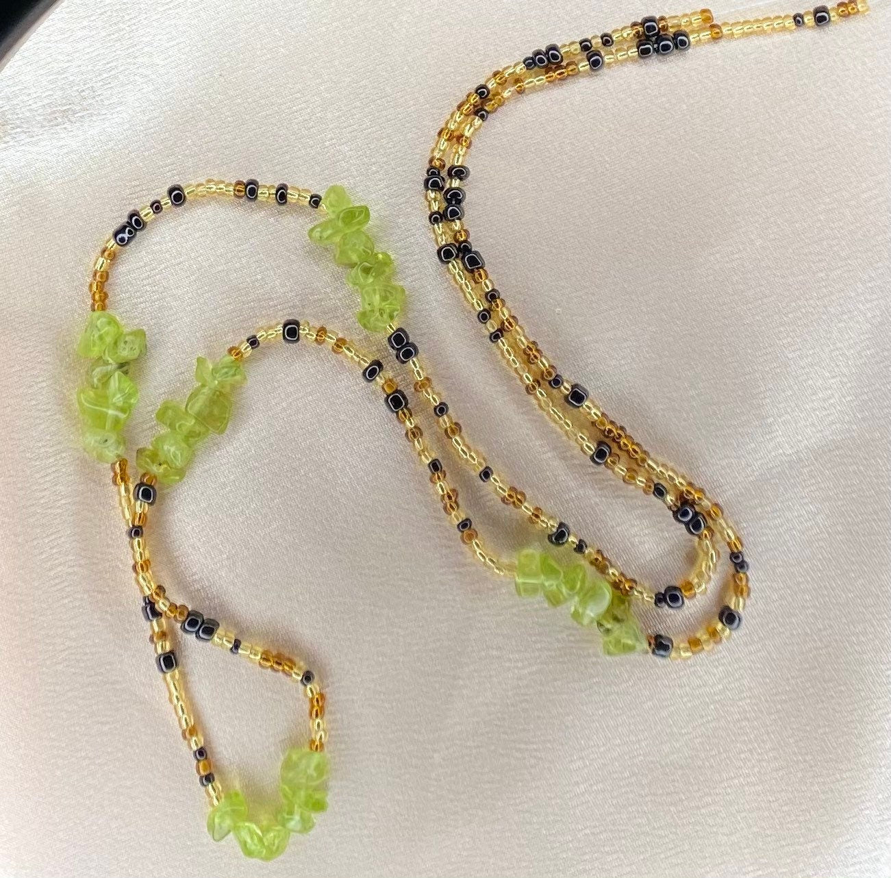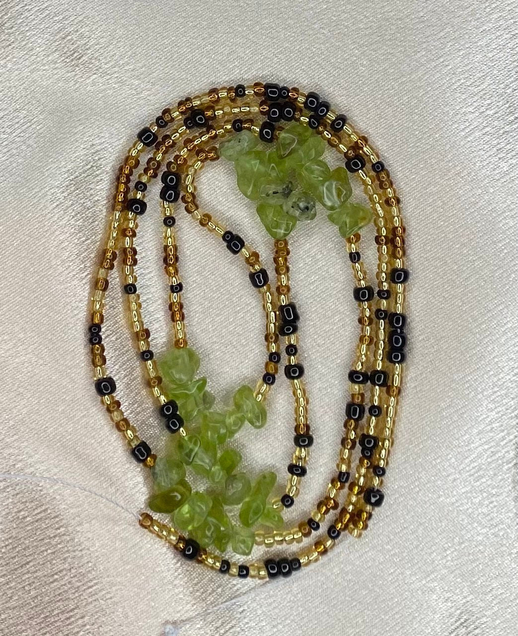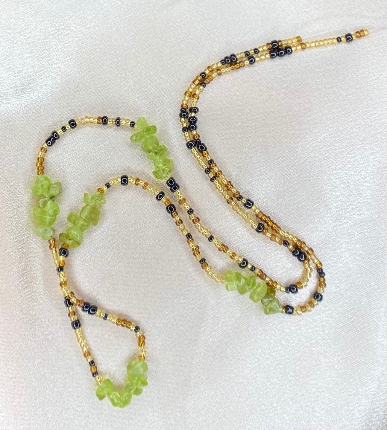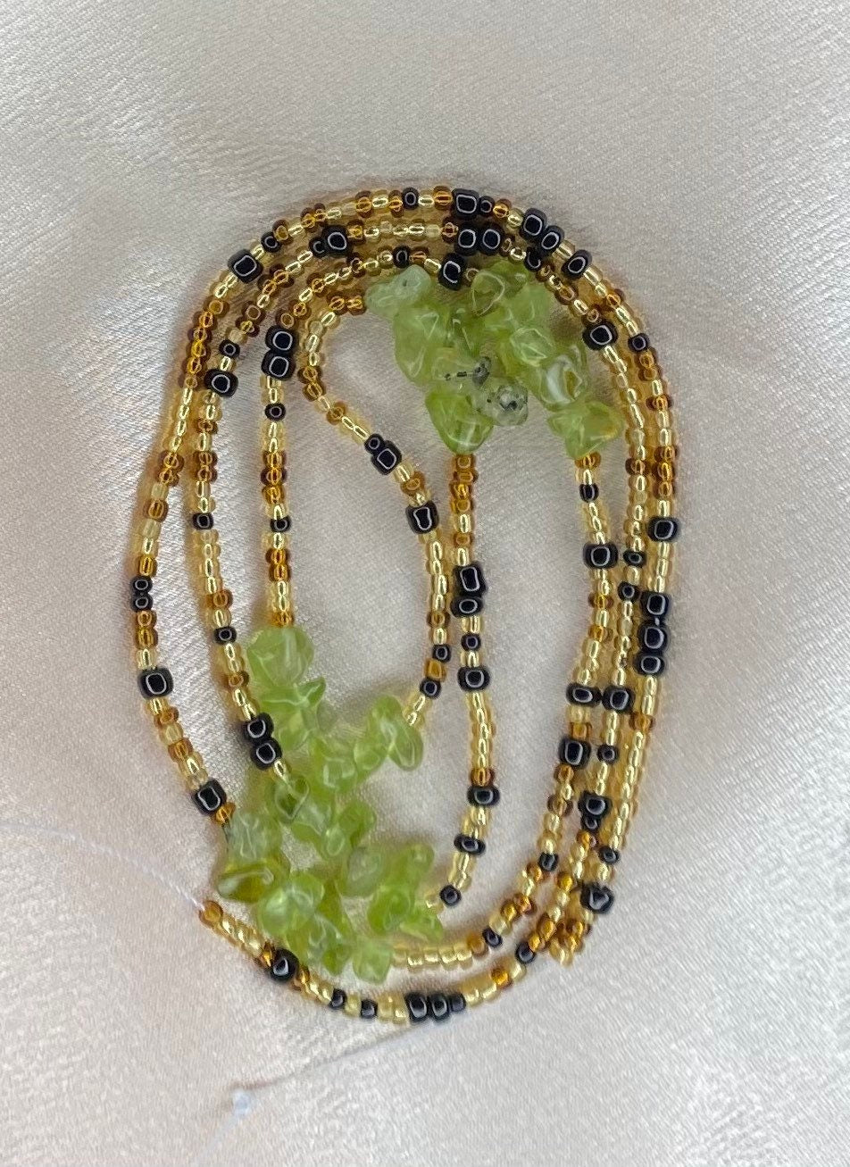 Made to order waistbeads with black, brown, and gold glass beads and peridot crystals ✨