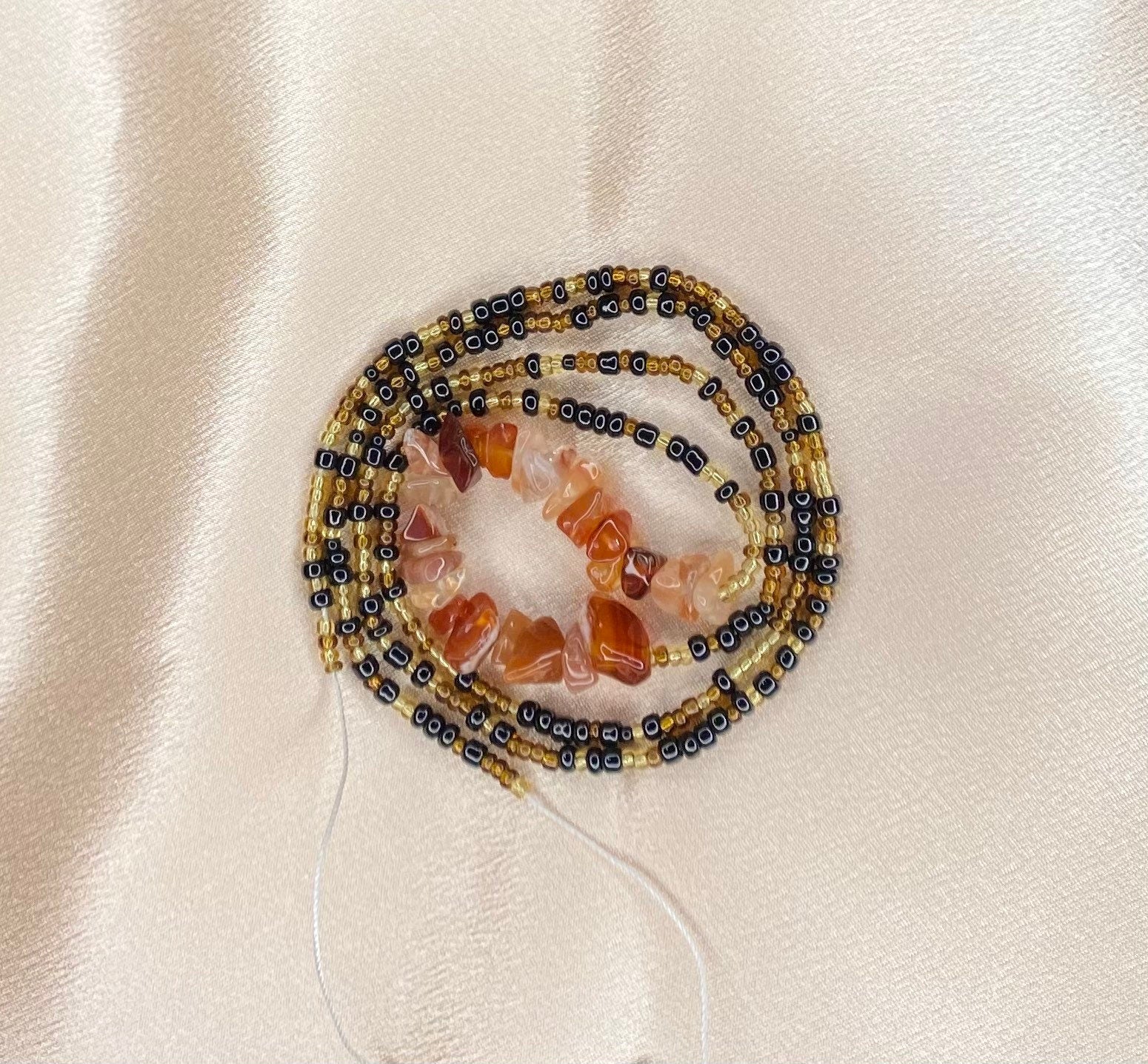 Made to order waistbeads with brown, black and gold glass beads with carnelian crystals!