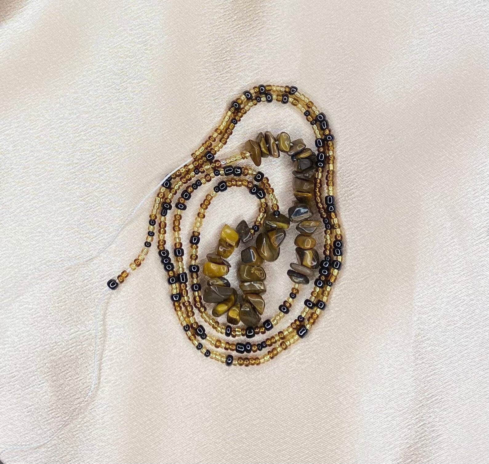 Made to order waistbeads with black, brown, and gold glass beads and tigers eye crystals!