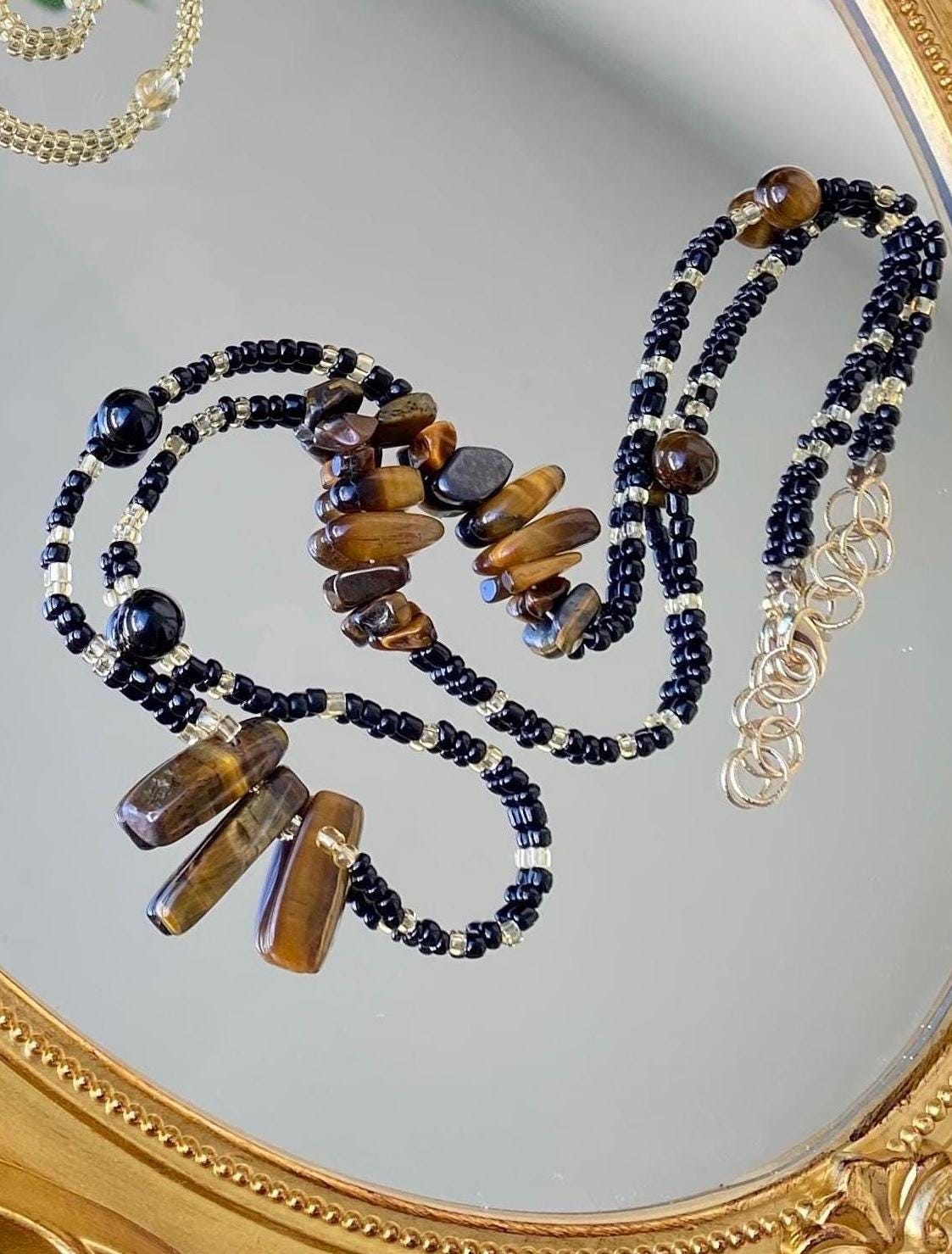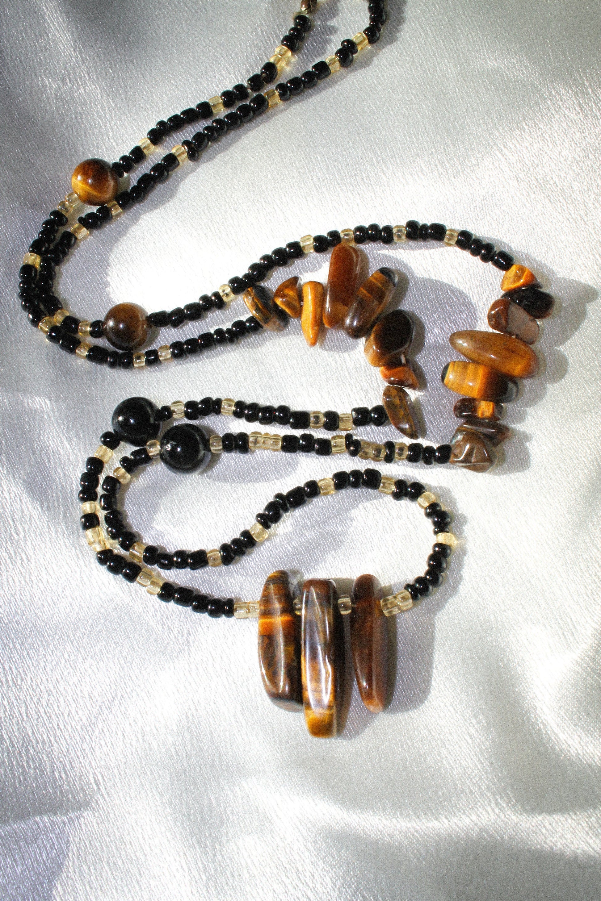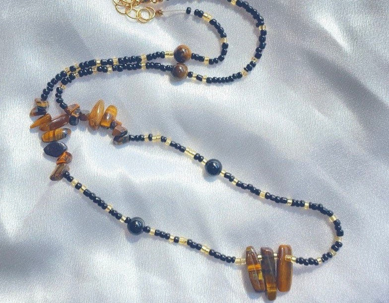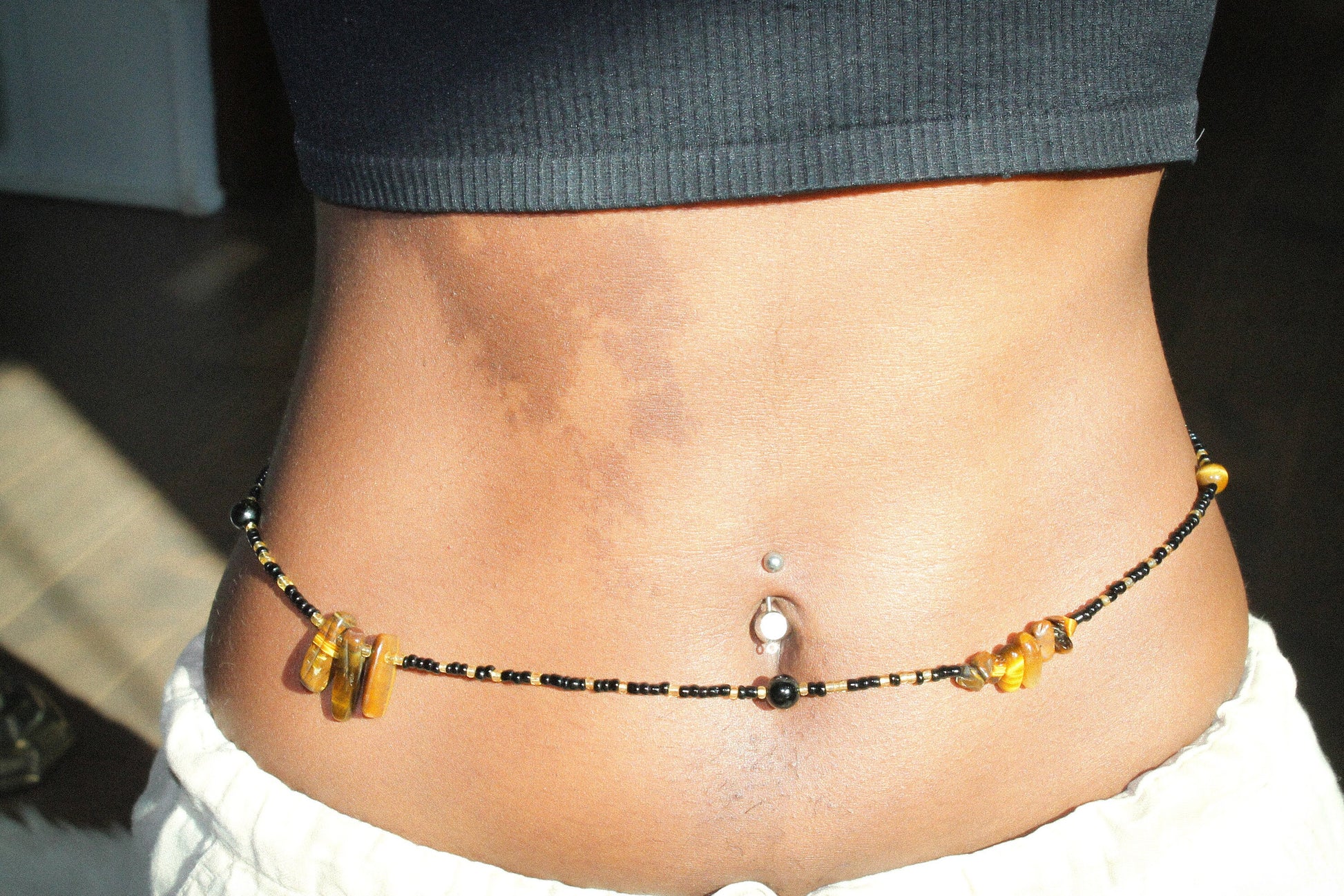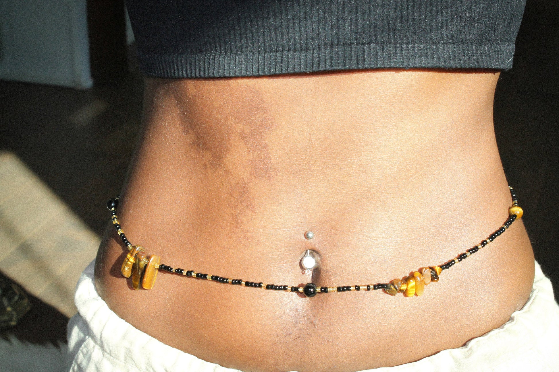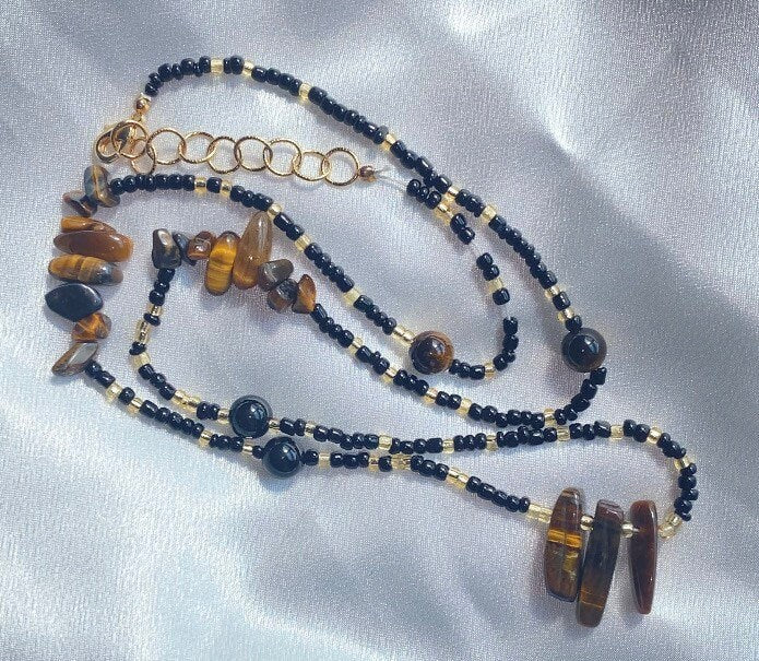 Made to order waistbeads with gold and black glass beads, obsidian and tigers eye crystals!