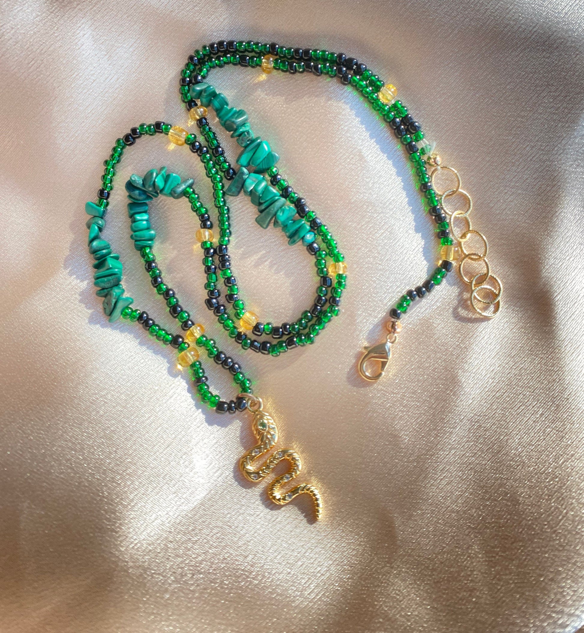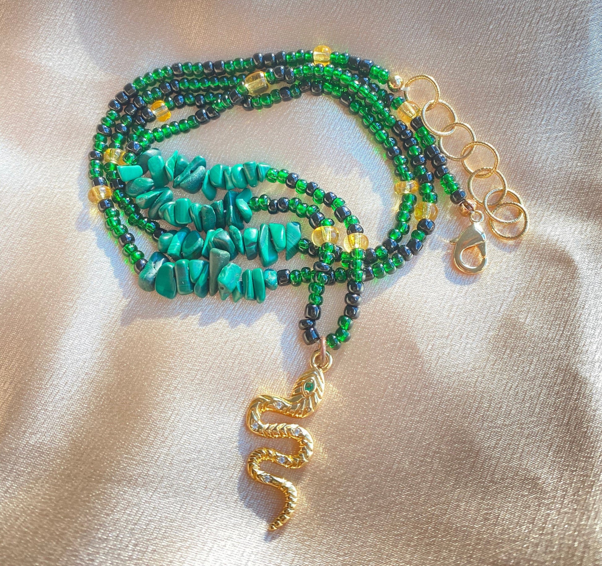 Made to order waistbeads with black, emerald green, and gold glass beads with Malachite crystals and a 14K gold filled serpent charm!