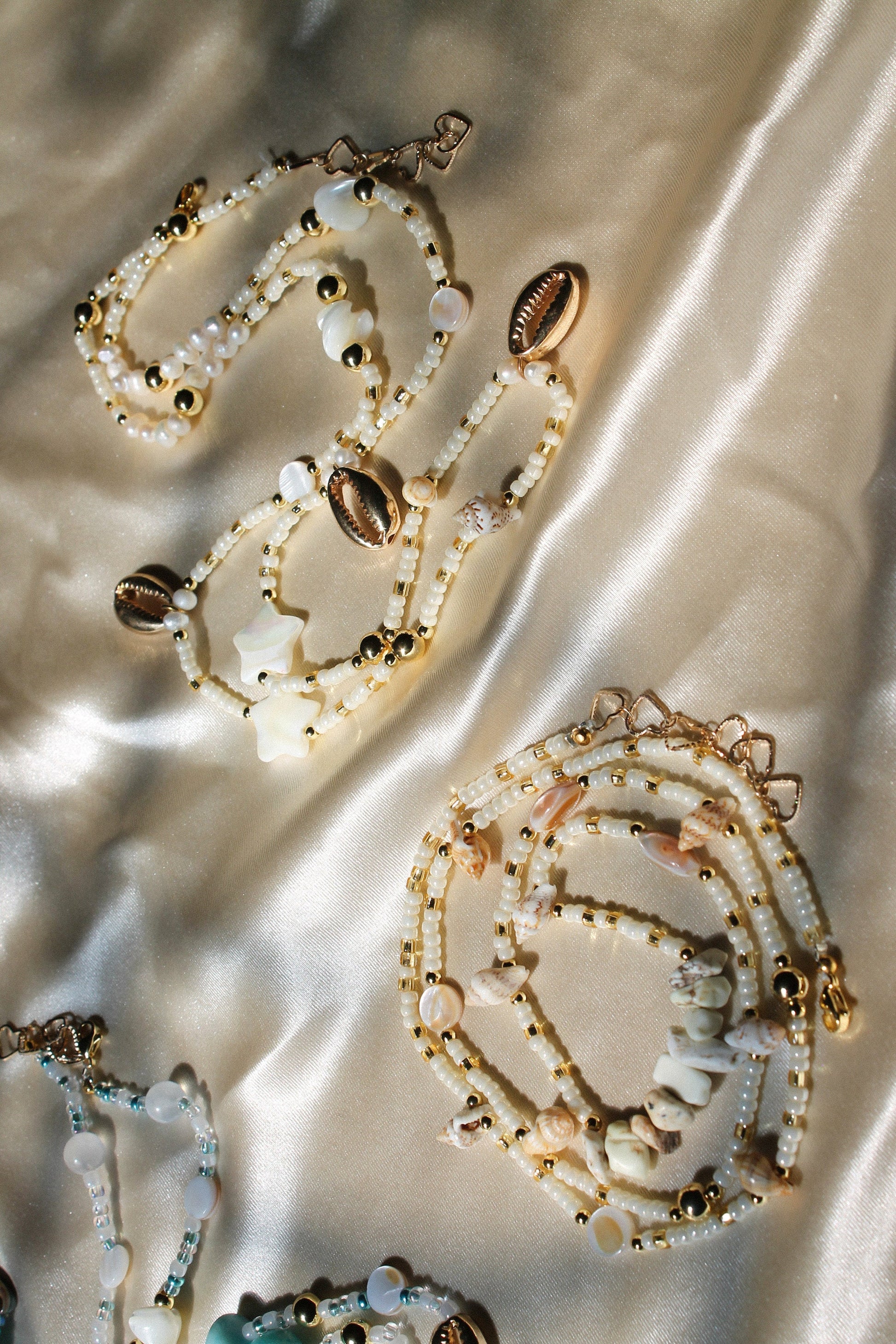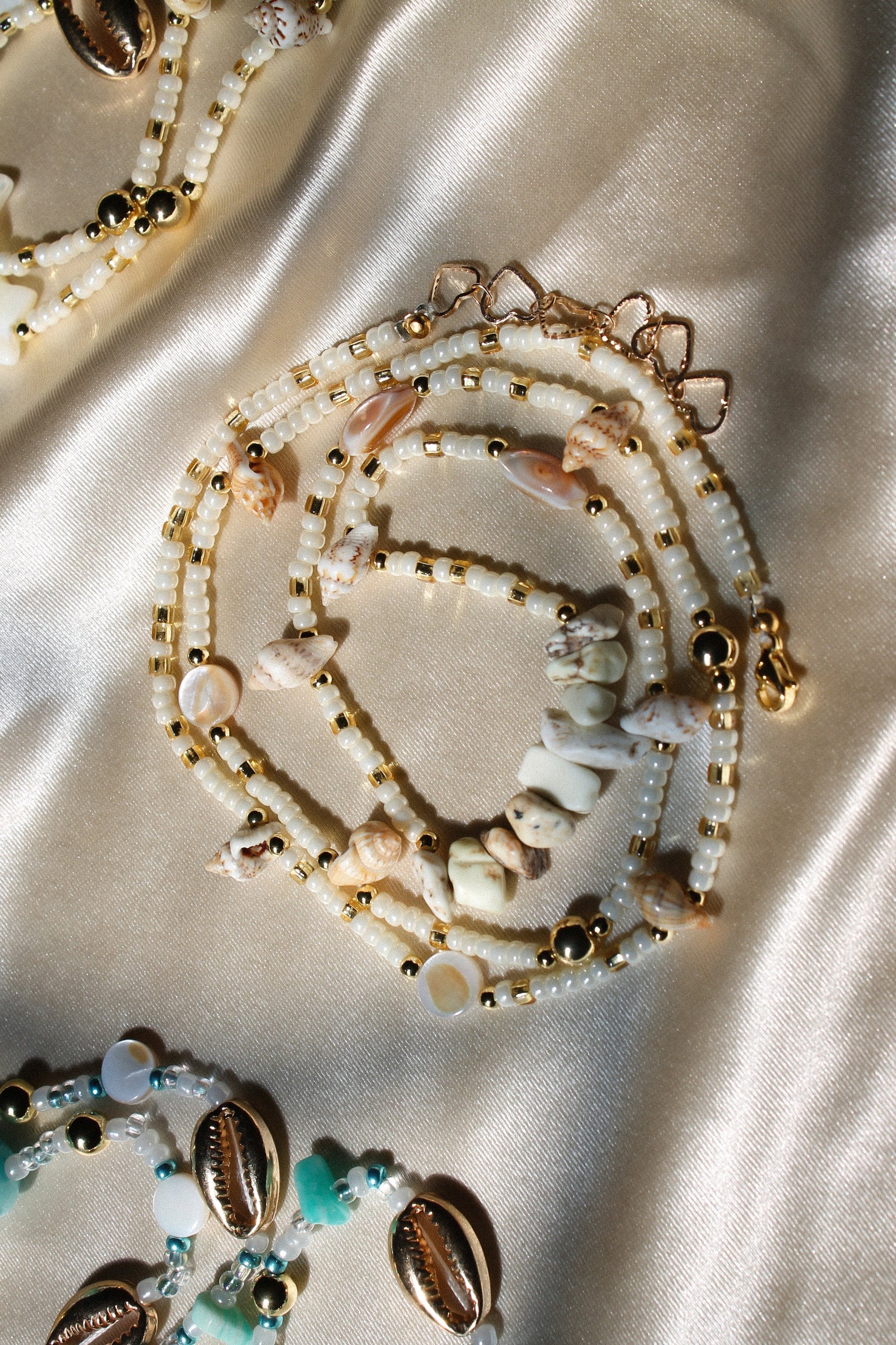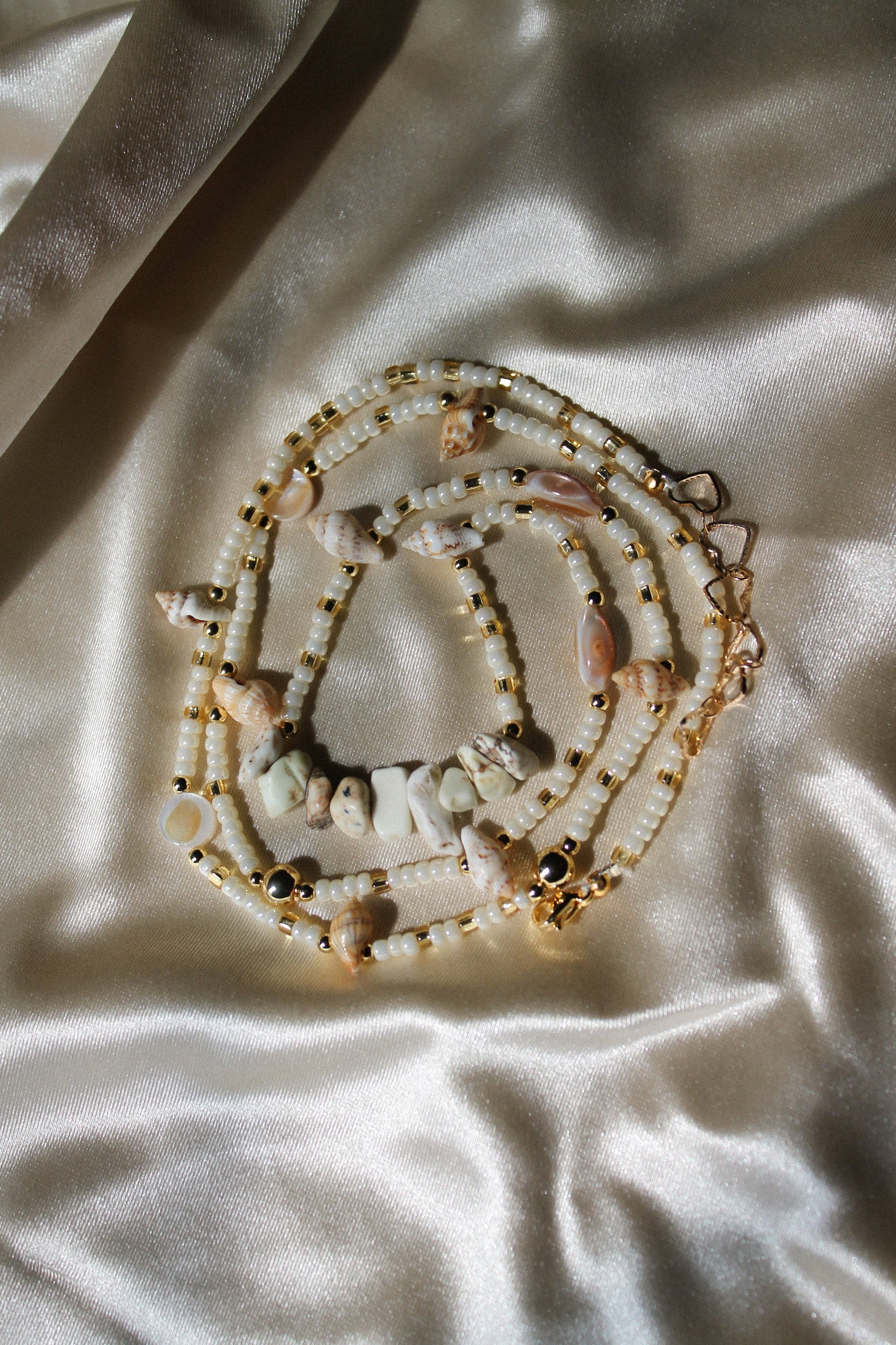 Made to order waistbeads with cream and gold glass beads, assorted pearls, shells and spiral beads, white turquoise crystals, and gold spheres.