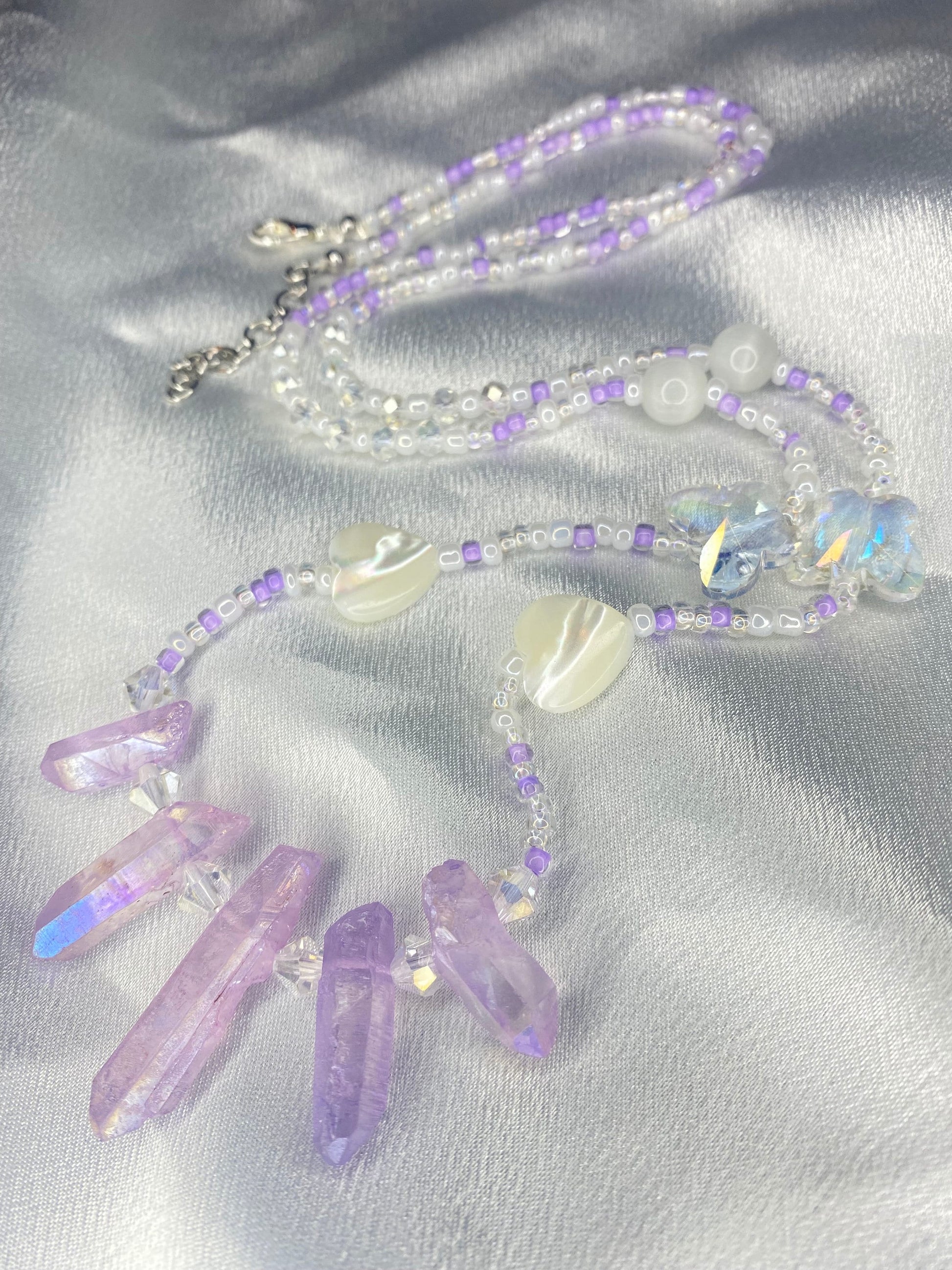 Made to order waistbeads with crystal rainbow, white, & lavender glass beads, lavender aura quartz, selenite spheres, & mother of pearl heart charms ✨