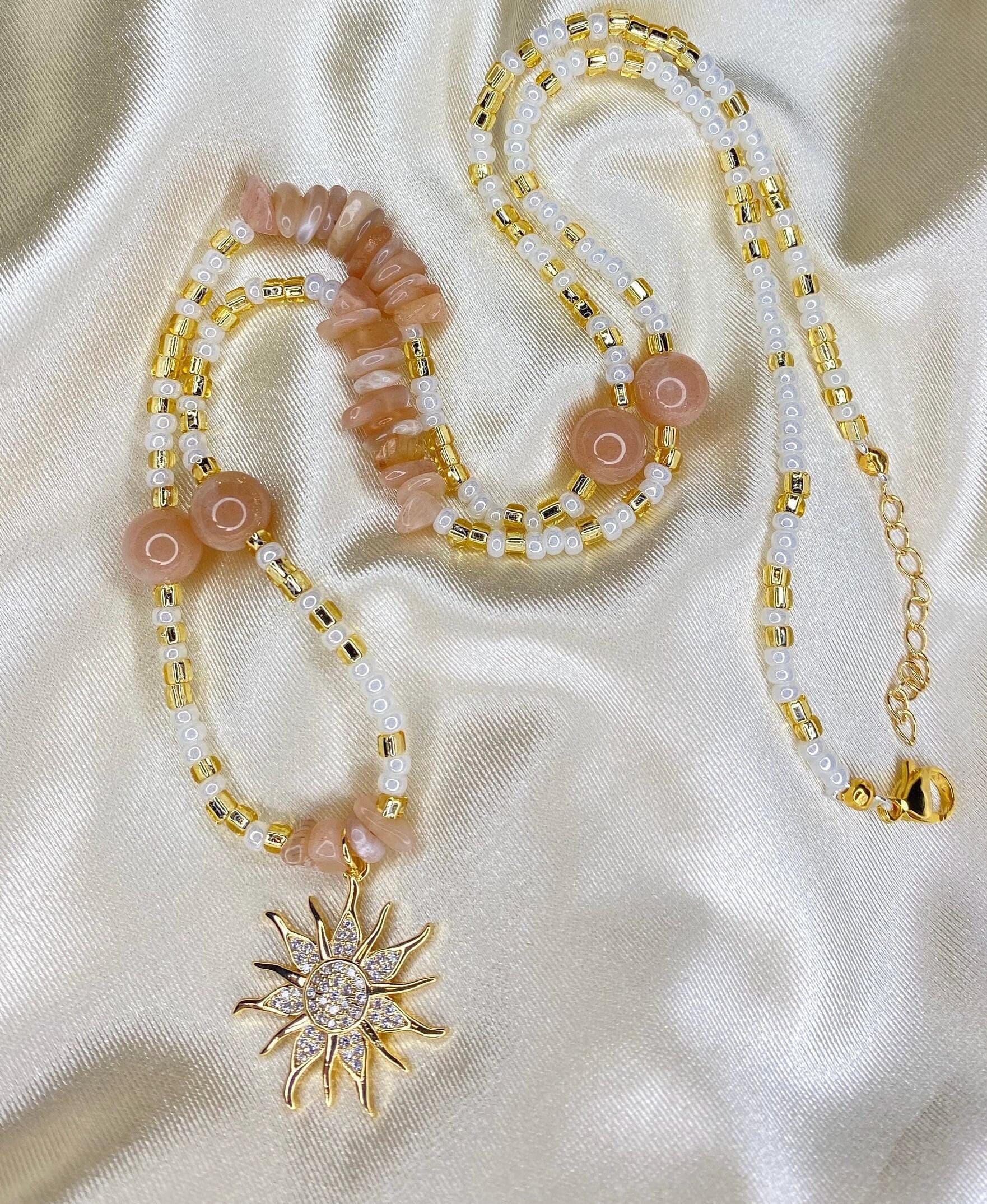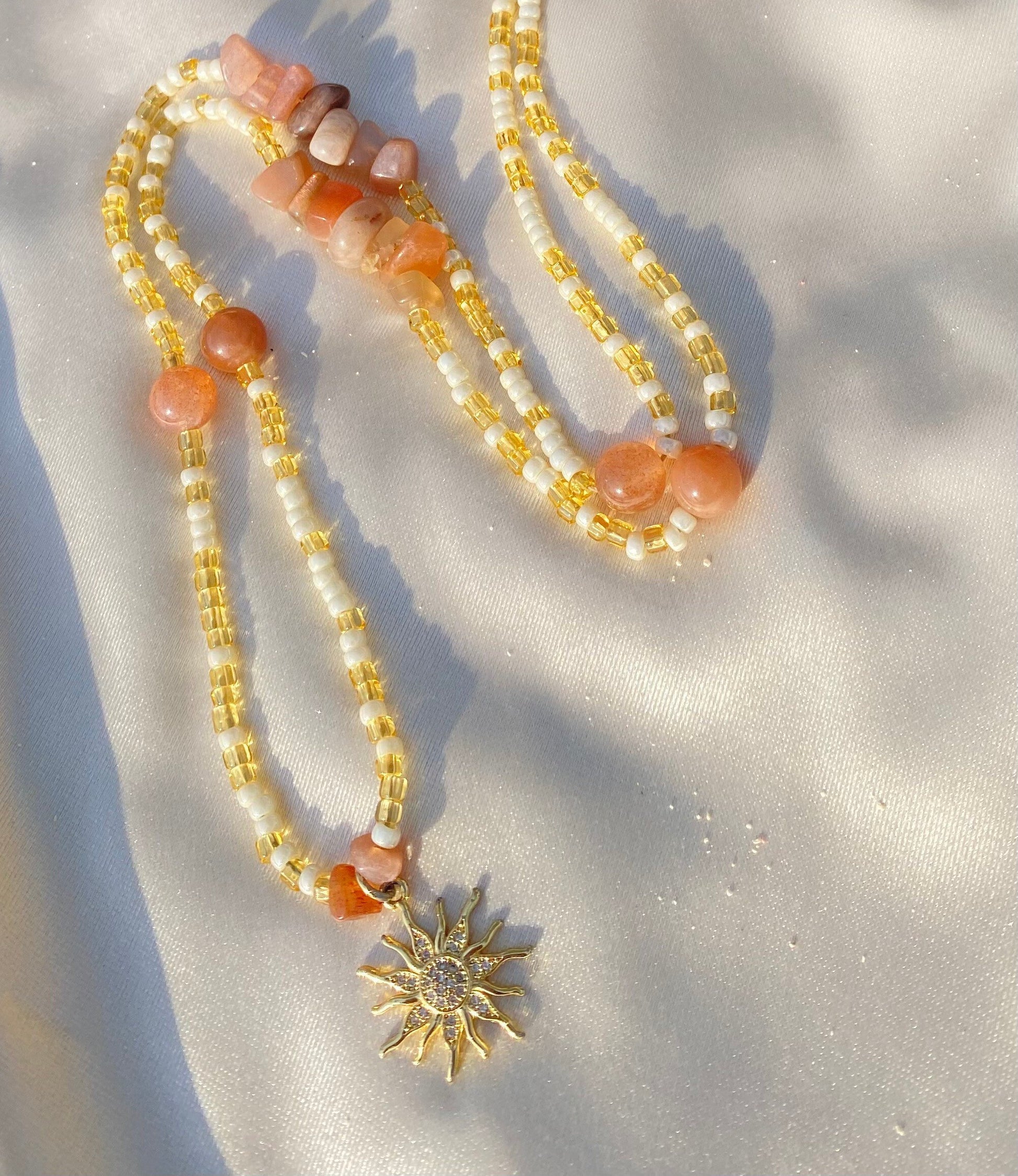 Made to order waistbeads with gold and cream glass beads, sunstone crystals, and a 14k gold filled sun charm!