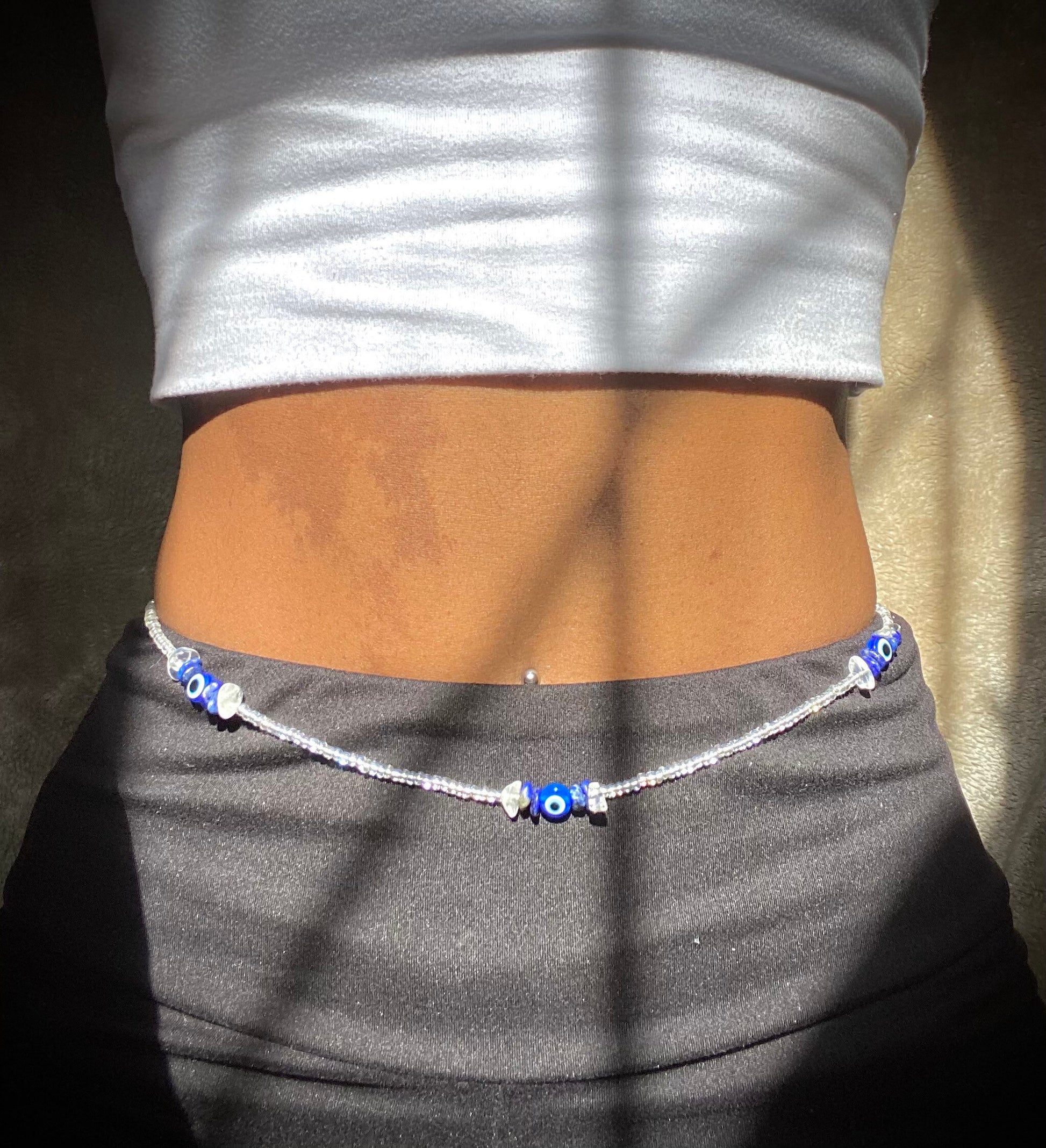 Made to order clear glass waist beads with Lapis Lazuli and Clear Quartz crystals!